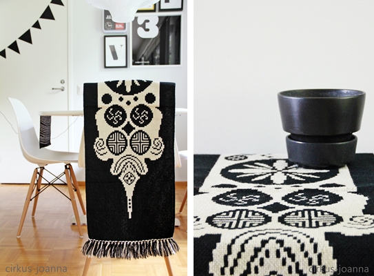 Nyt kuulkaa silmät ja korvat siellä kaikkialla auki ja minulle vinkkiä, jos törmäät tähän kaunistukseen jossakin. Tiiä vaikka joku kyseisen kirpparin tätin sattuisi vaikka tuntemaankin. Vai hautooko joku kaapin kätköissä tällaista aarretta? Myös muut musta(tai puna-)valkoiset täkänät/raanut kiinnostavat.